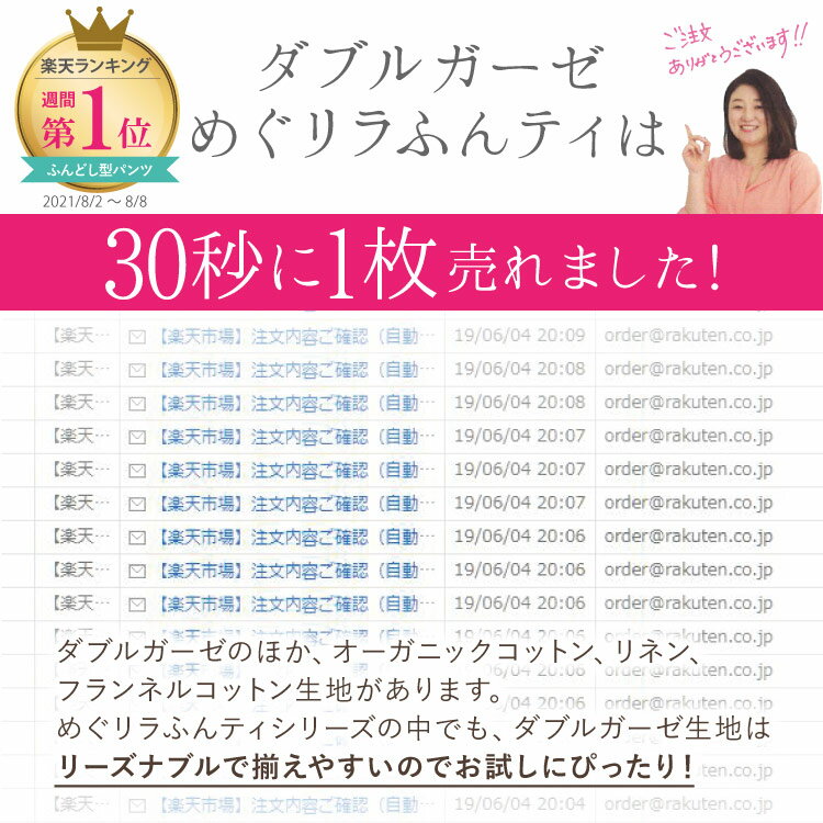 ※こちらはメール便送料込みのページです 2021年夏リニューアル!改良後もお値段据え置き! たくさんのお客様にご愛用いただいております『ダブルガーゼめぐリラふんティ』を、2021年6月5日にリニューアル! 日頃のご愛顧に感謝し、お値段は据え置き!品質を向上させてお届けいたします。