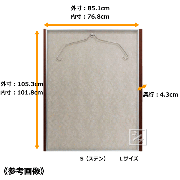 商 品 説 明 材質 アルミ・アルミにシート貼り・アクリル・ベニヤ サイズ 外寸法:幅851mm×高さ1053mm×奥行43mm 内部寸法:幅768mm×高さ1018mm 重量 5.8kg カラー S(ステン):フレームカラー/ステン サイド/木目セピア バックボード/ベージュ 付属品 ユニフォームハンガー・ダルマピン・吊りひも・直掛け用ネジ・パッケージ ユニフォーム対応サイズ L〜XLサイズに好適。