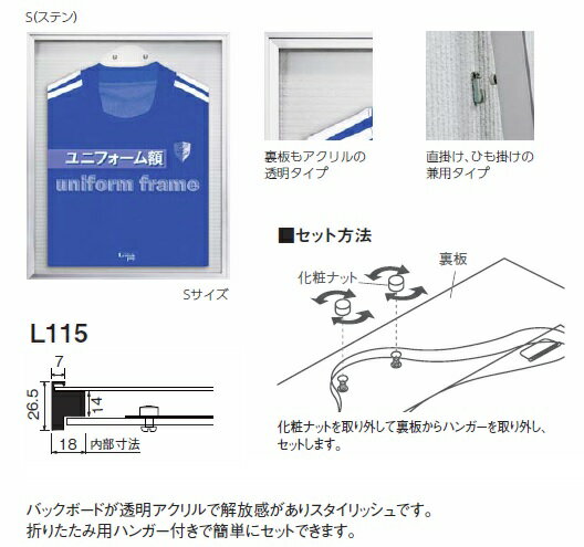 ================ メーカー株式会社オリジン サイズSサイズ450×550×27mm表面保護アクリルガラス材質アルミ製フレームカラー1種類付属品折ハンガー 透明クリップ2ウエイフック ビスSフック 透明紐 商品説明 軽くて丈夫なユニフォーム額です。